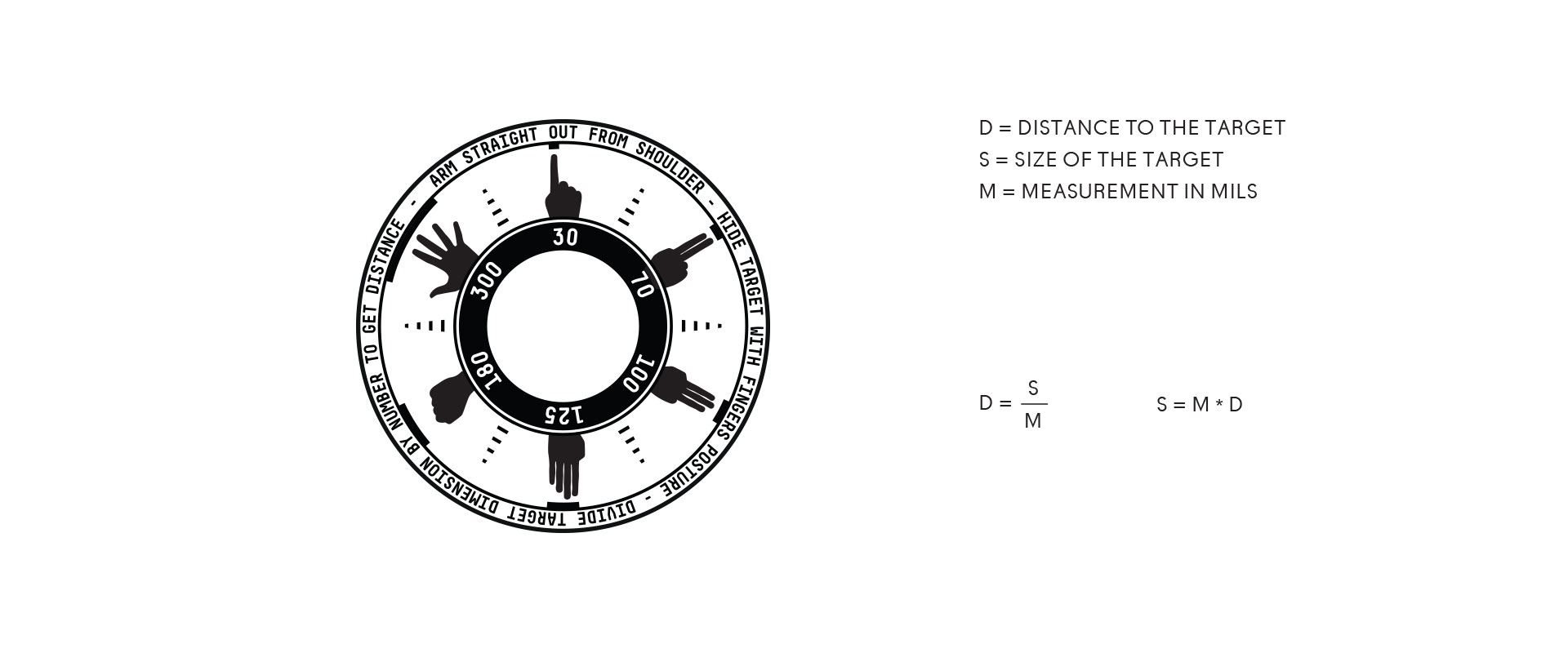 Given distance or size the scale can be used straightening your arm and covering the target with your fingers once established the ratio you can simply multiply or divide to get either size or distance of any object.